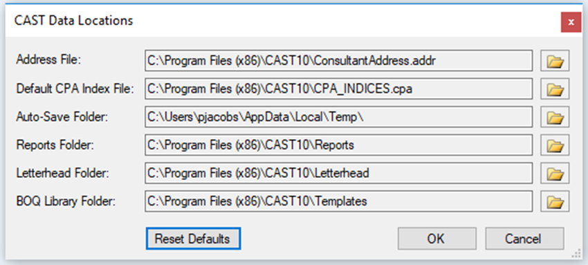 In this situation the files and folders can copied to a different folder where write permissions are not restricted (C:\CAST_data in the example below) and the file locations updated in CAST.